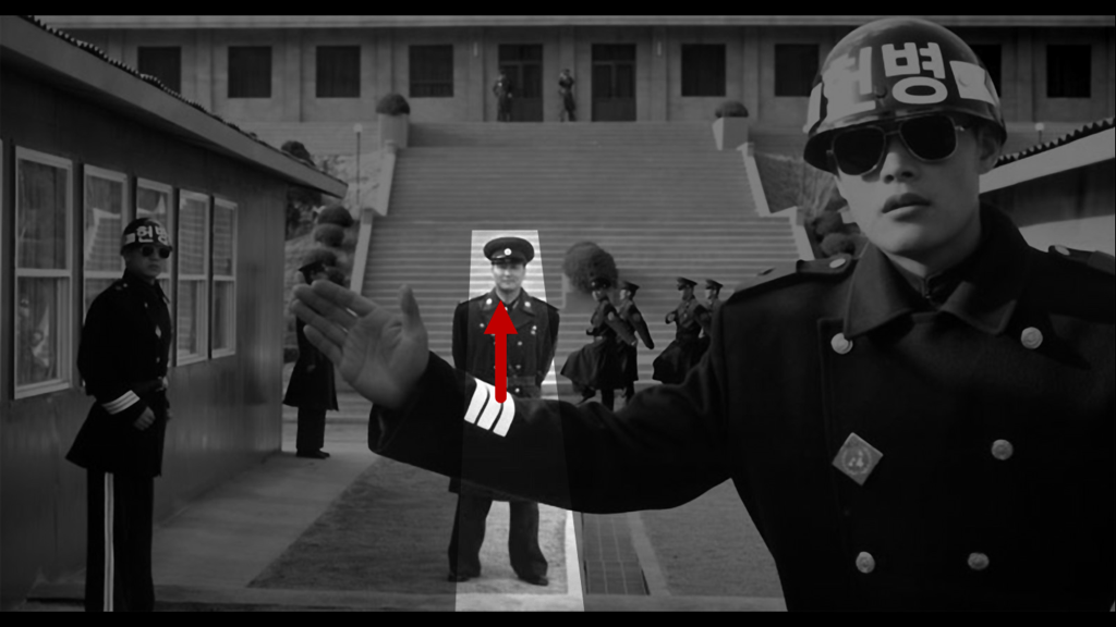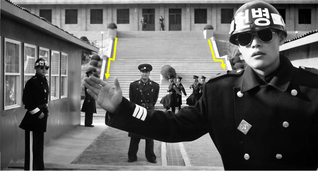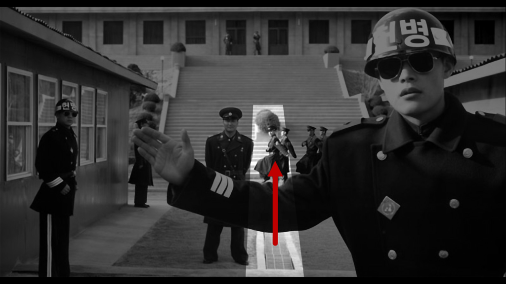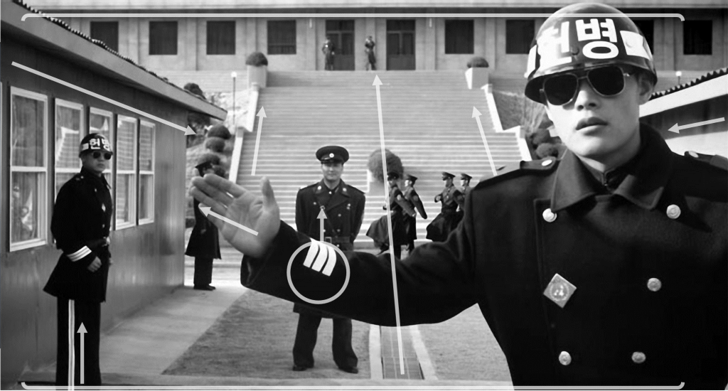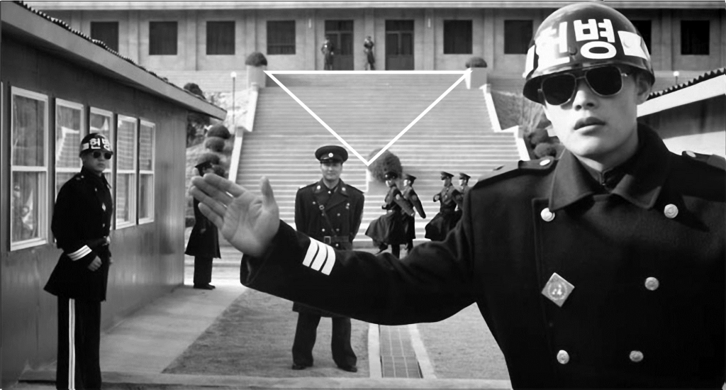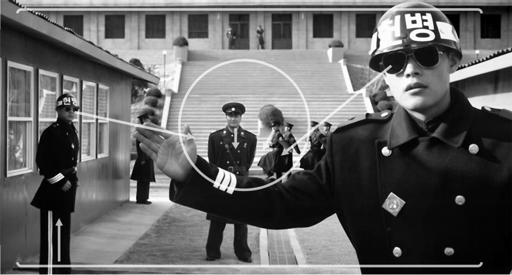 « Au niveau visuel JSA parait très complexe avec ces travellings circulaires qui vont dans tous les sens, l’alternance quasi-systématique entre lignes horizontales et verticales, les plongées et les contre-plongées qui se répondent, les jeux de lumière… Il fallait créer des conflits entres les images. Si un mouvement exprime une séparation, celui d’après doit représenter la réconciliation. La caméra défie la rigidité de l’espace de l’action. Un espace soumis à des règles très strictes, avec cette ligne qui sépare le monde en deux. »