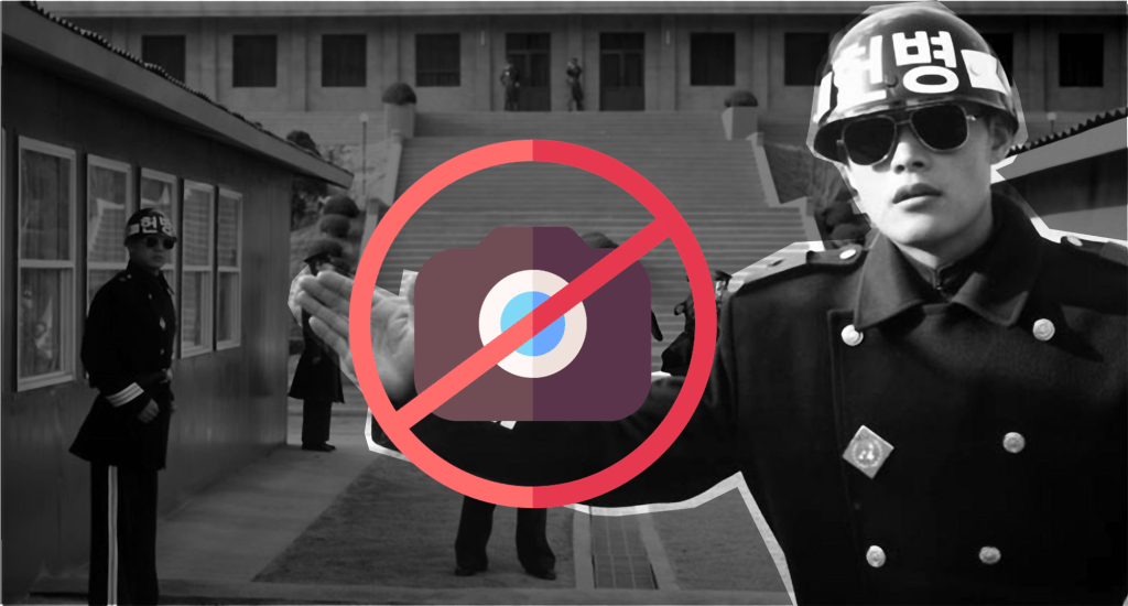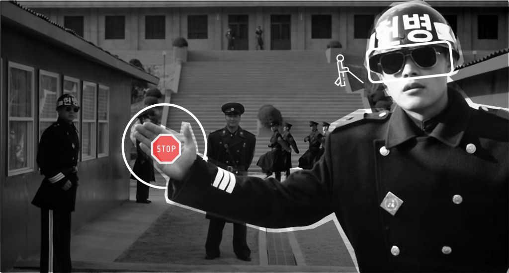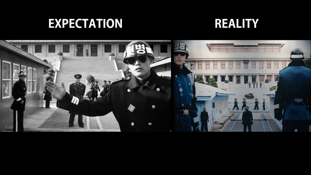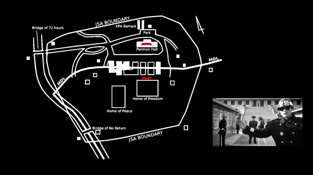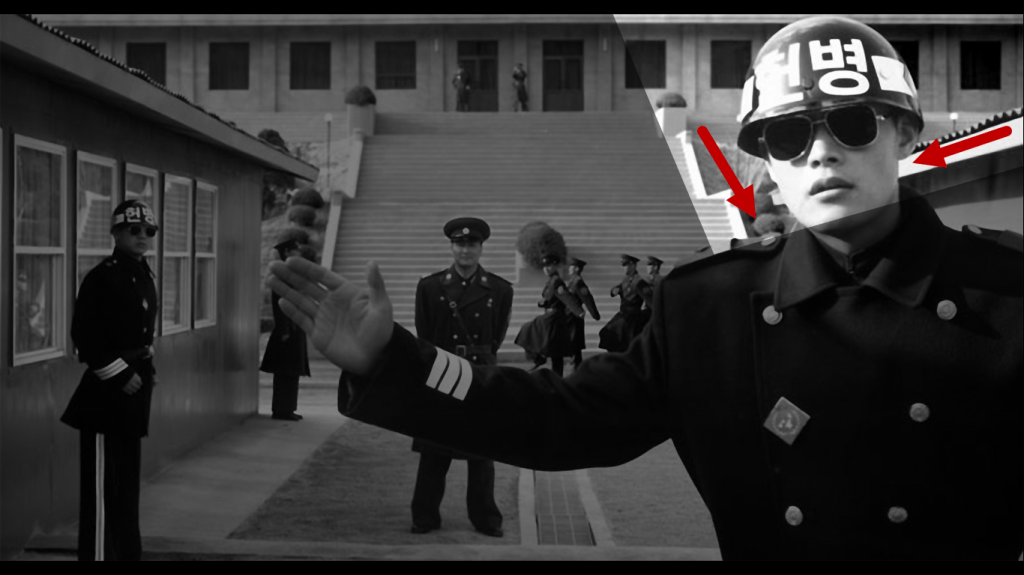« Au niveau visuel JSA parait très complexe avec ces travellings circulaires qui vont dans tous les sens, l’alternance quasi-systématique entre lignes horizontales et verticales, les plongées et les contre-plongées qui se répondent, les jeux de lumière… Il fallait créer des conflits entres les images. Si un mouvement exprime une séparation, celui d’après doit représenter la réconciliation. La caméra défie la rigidité de l’espace de l’action. Un espace soumis à des règles très strictes, avec cette ligne qui sépare le monde en deux. »