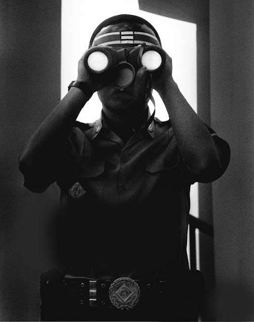 « Soixante-trois ans plus tard la zone démilitarisée est l’une des frontières les plus militarisées au monde. Kim Nyung-man (1949) le rappelle. Brutalement par la photographie de ce militaire observant derrière des jumelles. Ce que l’homme voit nous importe peu mais ce qu’il révèle nous regarde davantage. Une morphologie d’insecte sous sa cuirasse d’ombres. Une symétrie parfaite dans cet immobilisme de phasme. De celle qu’idolâtrent les militaires. Ordre, obéissance, stabilité tout est magnifié dans ce corps fermé. Comme la frontière qu’il protège et qu’il finit par incarner de façon métonymique : la partie pour le tout. Ce militaire est(à) la frontière. Pas seulement. Observez ses deux orbes irradiés, irradiants. Deux lentilles jumelles, pour deux frères jumeaux qui ne peuvent plus se voir ? Fausse illusion d’un parallélisme des formes. La belle harmonie gémellaire révèle moins la complétude de deux entités symétriques que la partition d’un tout : territoire et nation. La division fratricide laboure corps et âme »
