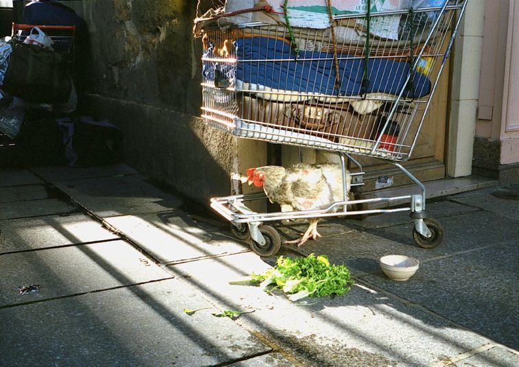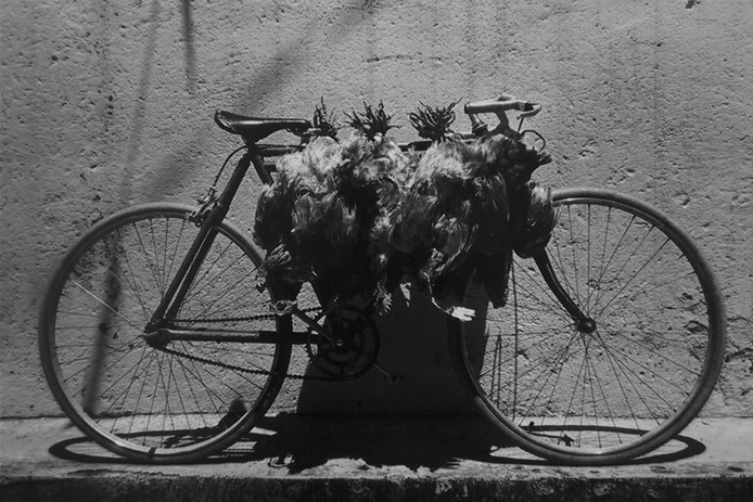 « La poule que je veux photographier sous un arbre, en hommage à Edouard Boubat ? Mais cette poule là n’est pas d’humeur à collaborer : elle refuse de faire les 20 cm qui me permettraient de faire le cliché parfait. Ou vais-je retenir ma photo de l’essaim de poules blanches attachées à une moto en hommage à Graciela Iturbide ? Quien sabe ? Qui sait ? »
