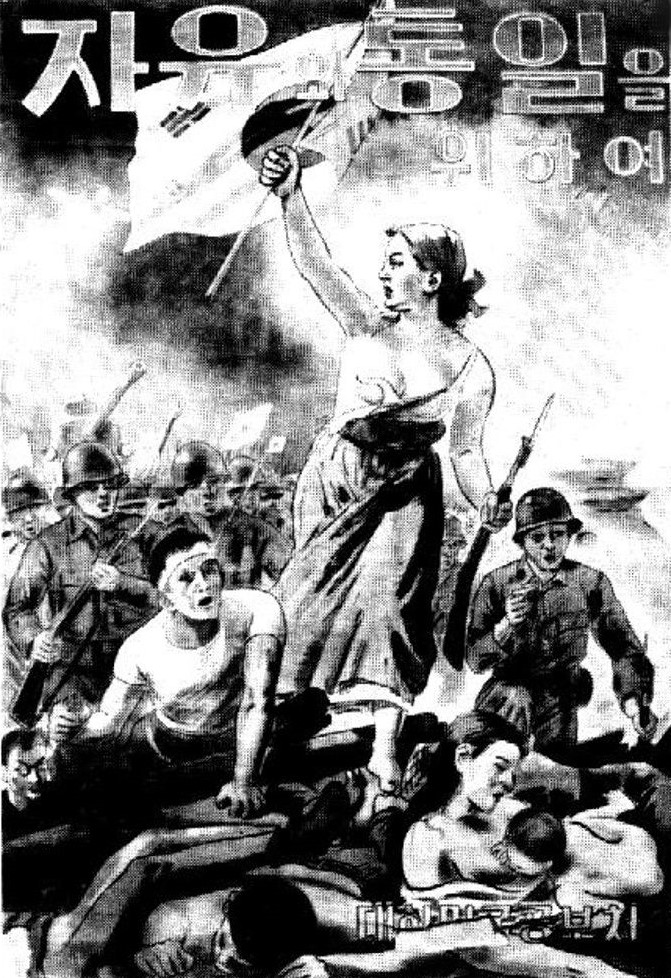 Face à la « propagande communiste » soutenue par Picasso, les autorités de Corée du Sud accusent le Nord de perpétrer des massacres et de bafouer les droits de l’homme des populations civiles. Une affiche de propagande sud-coréenne reprend à son compte le célèbre tableau de Eugène Delacroix à lagloire de la Révolution des 3 Glorieuses de juillet1830 à Paris qui renversaCharles X et amena sur le trône Louis Philippe « le Roi- bourgeois ». Mais l’affichiste sud coréen juge opportun de compléter sa composition par un autre référence à Delacroix – perçu comme le peintre du combat pour la liberté – : en bas de l’affiche à droite, l’enfant tétant le sein de la femme morte du tableau « Scènes du Massacre de Scio ».