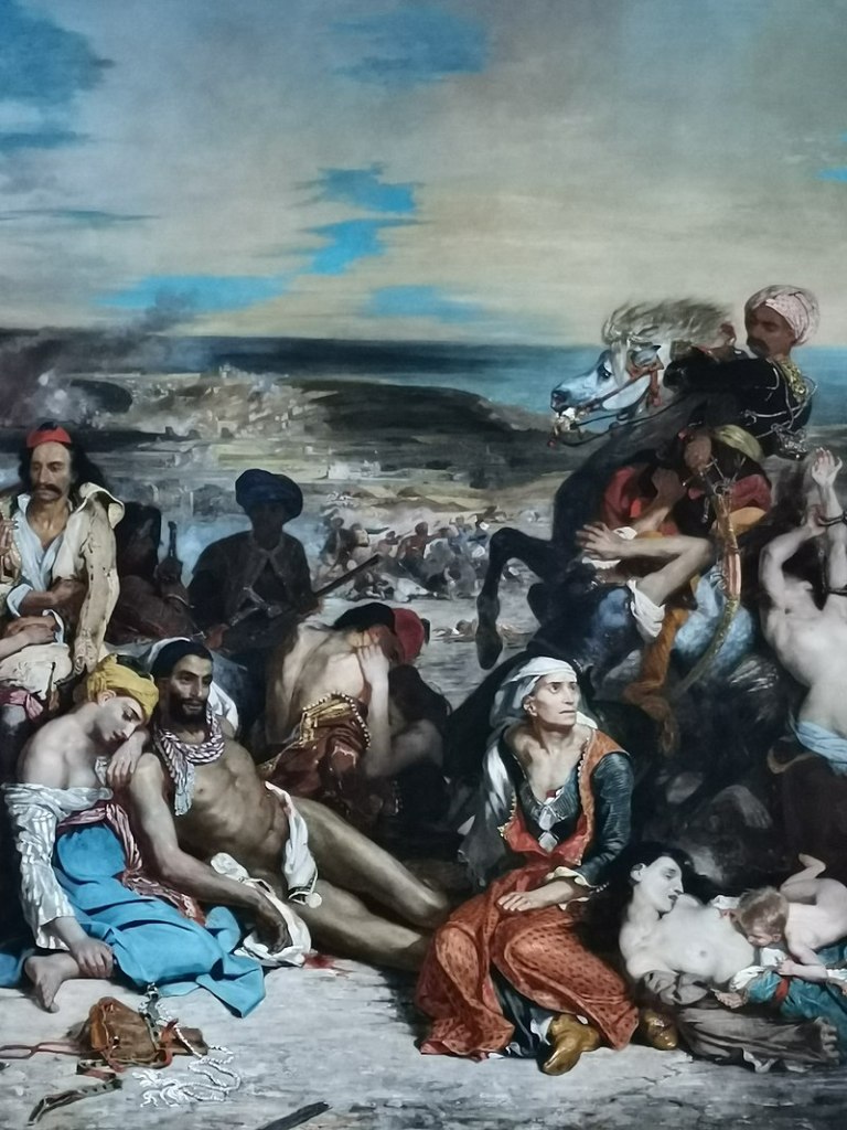 Mais l’affichiste sud coréen juge opportun de compléter sa composition par un autre référence à Delacroix – perçu comme le peintre du combat pour la liberté – : en bas de l’affiche à droite, l’enfant tétant le sein de la femme morte du tableau « Scènes du Massacre de Scio ».