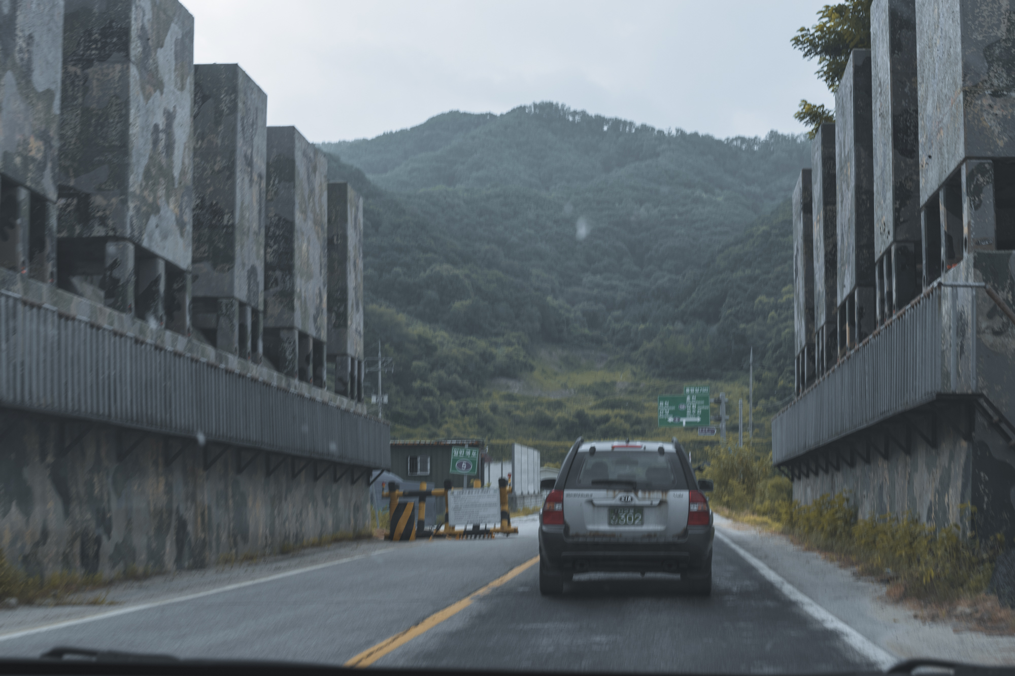 Passage d’un massif d’arrêt en béton sur une route dans la DMZ (les petits piliers sont bardés d’explosifs, qu’il y a juste a déclencher pour provoquer la chute des énormes blocs de béton et retarder l’avancée des chars ennemis) JoCh & the Pictures – 2018