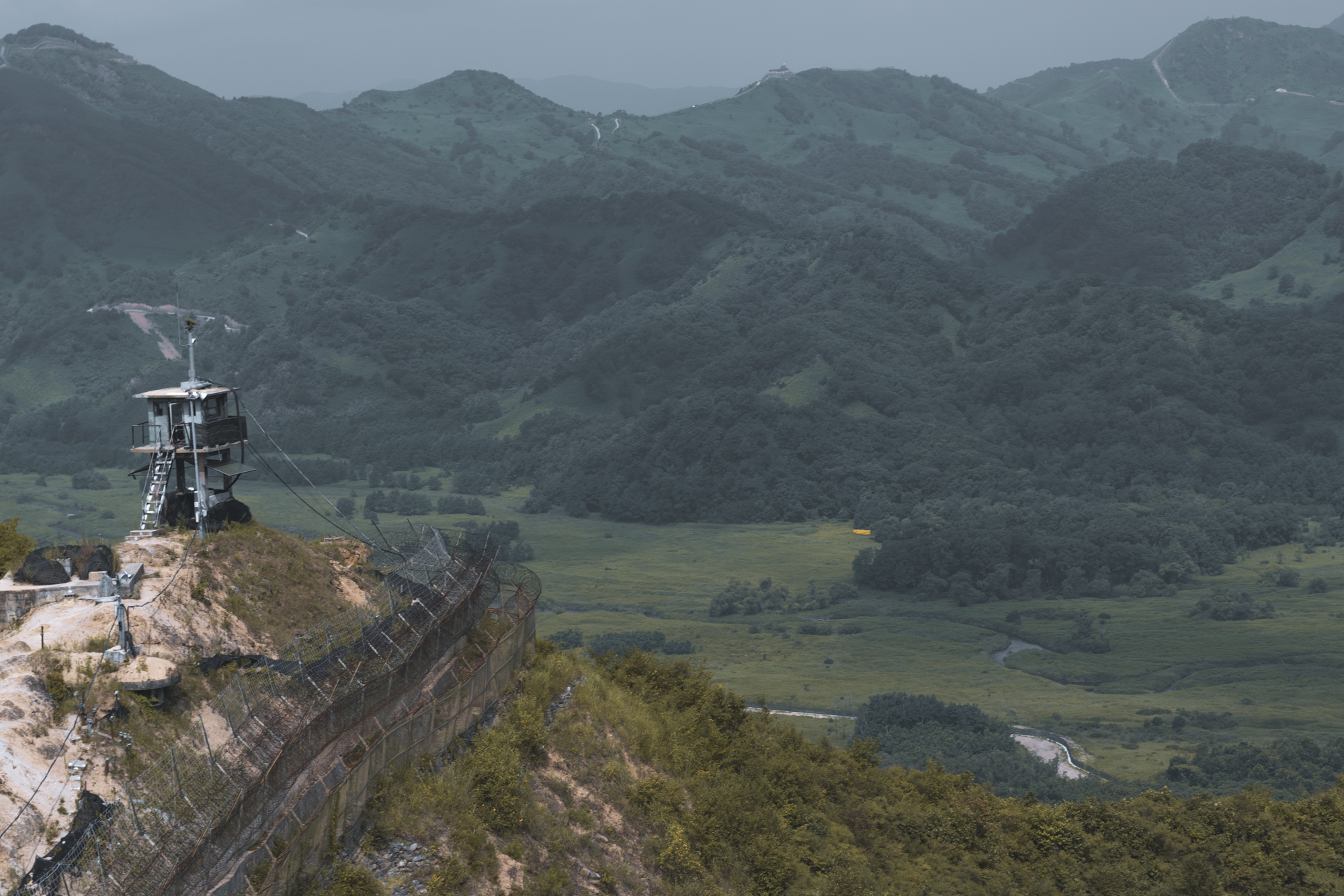 Mon incroyable grand angle (le fabuleux objectif du kit, avec son piqué tellement exceptionnel, son rendu proche de la perfection), ma passion et mon immense talent pour la photographie de paysage, vous présentent la Corée du nord nimbée dans sa brume mystérieuse et dramatique façon Tolkien. JoCh & the Pictures – 2018La tour de guet de la ROKA domine la vallée. JoCh & the Pictures – 2018Le général, sa fille et Elie prennent la pose dans la tour d’observation.Le portillon par lequel les hommes du général ont il y a quelques années fait passer le soldat déserteur qui s’était présenté jusqu’au grillage s’en avoir été repéré. Un moment de tension intense.